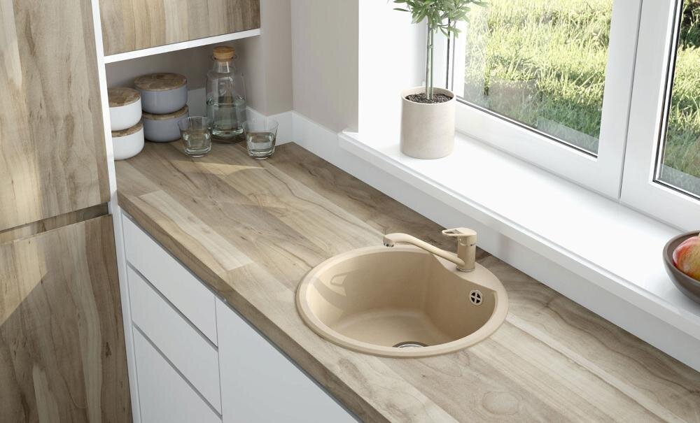 Warto zwrócić uwagę na budowę zlewozmywaka, który wykonany jest z naturalnego kompozytu granitowego, który jest połączeniem piasku kwarcowego oraz żywic. Dzięki temu Twój zlewozmywak jest odporny na wysoką temperaturę (250°C), przebarwienia, szok termiczny, uderzenia oraz zarysowania. Istnieje także możliwość podłączenia zlewozmywaka do zmywarki.