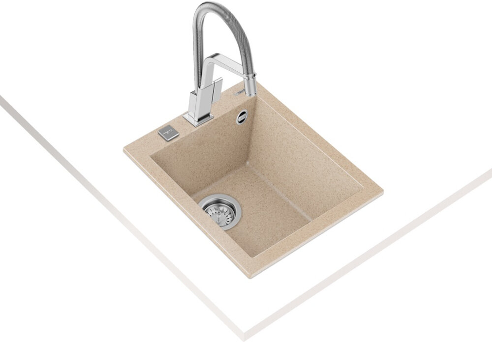 Aksamitna, matowa powierzchnia o głębokim, beżowym kolorze. Wybierz ten zlew do nowoczesnej kuchni z meblami o jasnym wybarwieniu.