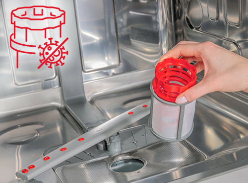 Filtr ze specjalną powłoką antybakteryjną zapewnia eliminację patogenów oraz redukcję nieprzyjemnych zapachów ze zmywarki.