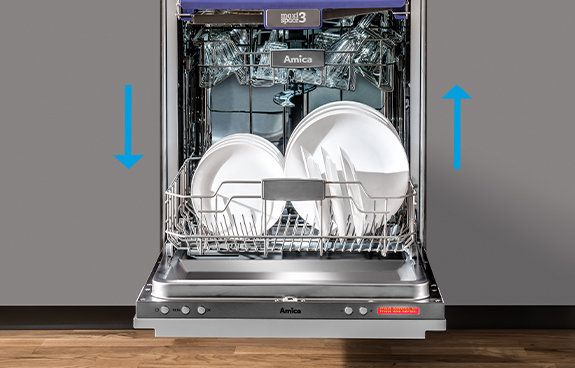 Chciałbyś, aby w Twojej zmywarce regulacja wysokości górnego kosza odbywała się szybko i sprawnie? W zmywarkach Amica jest to możliwe nawet przy pełnym załadunku! Wystarczy tylko, że wysuniesz kosz i przy pomocy poręcznych uchwytów podniesiesz go lub opuścisz, bez konieczności rozładowywania! Dzięki temu zyskasz możliwość zagospodarowania przestrzeni zmywarki zgodnie ze swoimi potrzebami w danej chwili i umieszczenia w niej nawet bardzo dużych naczyń, garnków lub patelni. System Up&Down - tak jak sobie tego życzysz!