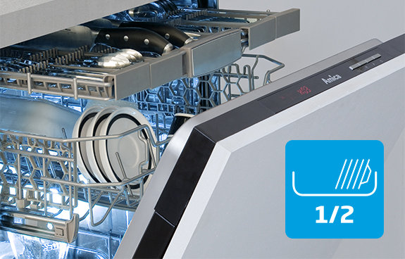 Oszczędność czasu i pieniędzy, dzięki funkcji ½ załadunku - wystarczy zapełnić jeden kosz lub oba jednocześnie przy zmniejszonej o połowę ilości naczyń.