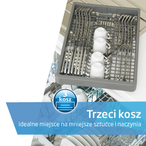 Trzeci kosz to nic innego jak dodatkowa szuflada w urządzeniu, umożliwiająca umycie sztućców czy mniejszych naczyń, takich jak filiżanki do espresso lub kubeczki. To również sposób na jeszcze łatwiejsze użytkowanie zmywarki oraz uporządkowanie naczyń znajdujących się w jej wnętrzu.