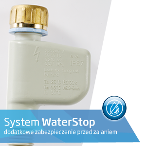 Dla jeszcze większego bezpieczeństwa używania zmywarek Beko wprowadziło system WaterStop, który automatycznie odcina dopływ wody z kranu do urządzenia. System jest zainstalowany na wężu, więc skutecznie zabezpiecza produkt przez zalaniem pomieszczenia lub niekontrolowanym wyciekiem wody.