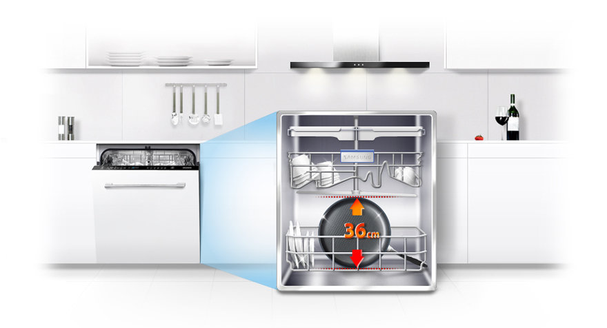 Tylko do nowej zmywarki Samsung możesz włożyć naczynie o rozmiarze aż 36 cm. Teraz możesz łatwo zmywać tak duże naczynia jak blachy do pieczenia ciasta i pizzy oraz tortownice.
