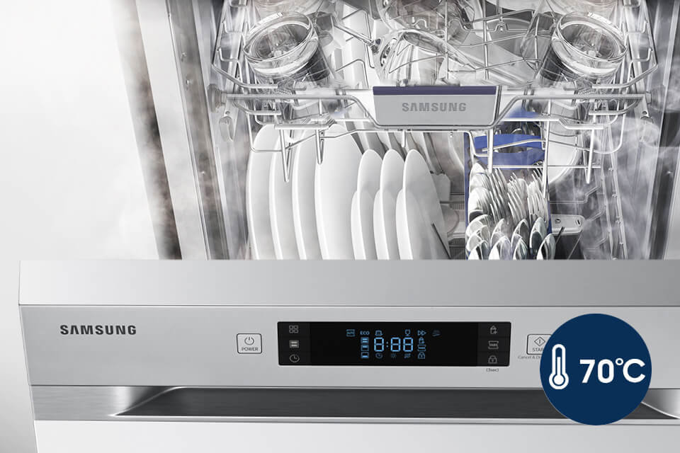 Kilkuminutowe utrzymanie bardzo wysokiej temperatury zwalcza szkodliwe drobnoustroje pozostawiając naczynia sterylnie czyste. Podgrzanie wody do 70°C rozbija cząsteczki detergentu i umożliwia ich pełne usunięcie z umytych naczyń. Funkcja dezynfekcji to perfekcyjna czystość niezależnie od trwałości zabrudzeń.
