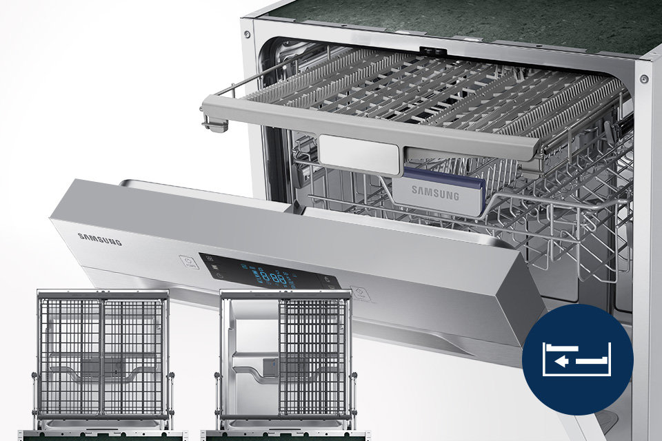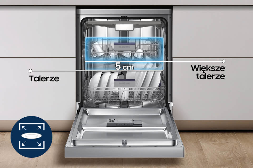 Praktyczne rozwiązanie umożliwia dopasowanie wnętrza zmywarki do wielkości naczyń poprzez regulację wysokości górnego kosza. Nawet niestandardowej wielkości talerze, półmiski czy deski do krojenia zmieścisz wewnątrz zmywarki. Wysokość górnego kosza można łatwo regulować w zakresie 5 cm, w górę i w dół.