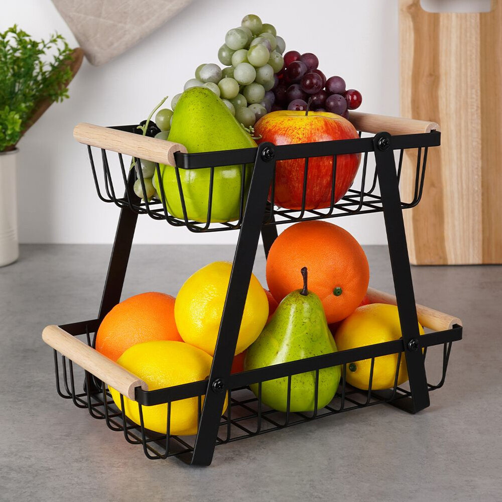 Praktyczny, dwupoziomowy koszyk na owoce i warzywa. Wykonany z wytrzymałych materiałów. Koszyk jest wielofunkcyjny i może być również wykorzystywany do przechowywania drobnych produktów codziennego użytku czy artykułów biurowych. Jest stabilny, praktyczny i poręczny, wyposażony w wygodne uchwyty, które ułatwią przenoszenie. Koszyk na owoce utrzymany w modnym połączeniu czarnego koloru z drewnem, więc efektownie prezentuje się w każdym wnętrzu. Idealny do każdej kuchni oraz jadalni. Oryginalny produkt marki Vilde. Wyprodukowano zgodnie z europejskimi standardami.