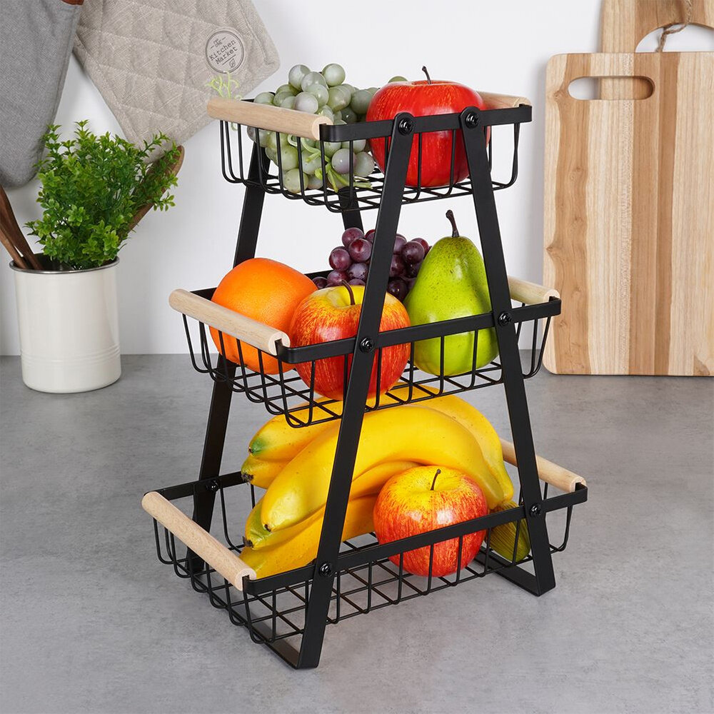 Praktyczny, trzypoziomowy koszyk na owoce i warzywa. Wykonany z wytrzymałych materiałów. Koszyk jest wielofunkcyjny i może być również wykorzystywany do przechowywania drobnych produktów codziennego użytku czy artykułów biurowych. Jest stabilny, praktyczny i poręczny, wyposażony w wygodne uchwyty, które ułatwią przenoszenie. Koszyk na owoce utrzymany w modnym połączeniu czarnego koloru z drewnem, więc efektownie prezentuje się w każdym wnętrzu. Idealny do każdej kuchni oraz jadalni. Oryginalny produkt marki Vilde. Wyprodukowano zgodnie z europejskimi standardami.