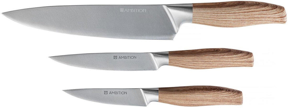 Zestaw trzech noży marki AMBITION z kolekcji Noir. Ostrza wykonane ze stali nierdzewnej są niezwykle ostre i trwałe, a ergonomiczna rękojeść zapewnia komfort użytkowania i wygodnie leży w dłoni.
