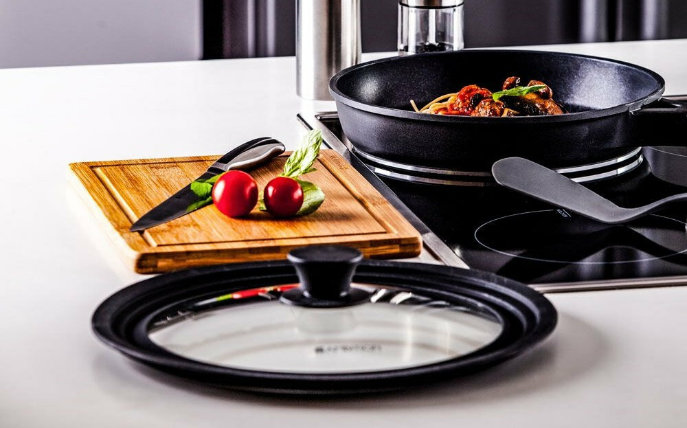 Pokrywa AMBITION Misty przeznaczona do naczyń o średnicach 20, 22 i 24 cm, to szklana pokrywa z silikonową gałką i rantem. Każdy jej rozmiar dopasowany jest do 3 różnych średnic naczyń. Przeznaczone do używania w temperaturach od -30°C do +230°C. Dostosowane do czyszczenia w zmywarce.
