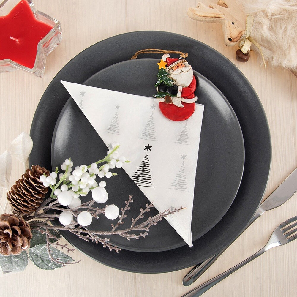 ✅ Świąteczny motyw choinki - Wykonane z papieru w kolorze białym z eleganckim srebrnym nadrukiem choinek, które wprowadzą ciepły, świąteczny nastrój na Twoim stole.
