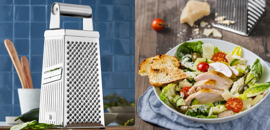 Klasycznie wyglądająca wielofunkcyjna tarka kuchenna to połączenie tradycyjnej formy z bardzo ostrymi ostrzami ze stali nierdzewnej Cromargan®.