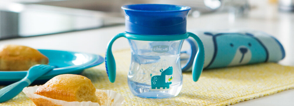 Specjalna silikonowa membrana zabezpiecza krawędź kubeczka przed rozlaniem znajdującego się w nim płynu. Dziecko, pociągając łyk napoju, wytwarza niewielki otwór w membranie, przez który napój się wydostaje. Dziecko może pić z dowolnego miejsca na całym obwodzie kubeczka! Ergonomiczne uchwyty będą świetne na początek nauki, z czasem można je usunąć.