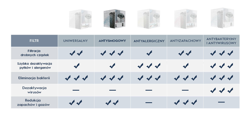 Każdy dom jest inny. Właśnie dlatego opracowaliśmy zestaw filtrów dostosowanych do konkretnych warunków powietrza w pomieszczeniach i do odpowiednich potrzeb. Czy to jest filtracja nieprzyjemnych zapachów, alergenów czy pyłów PM1.0, PM2.5 i PM10, każdy użytkownik będzie mógł znaleźć odpowiedni filtr dla siebie.