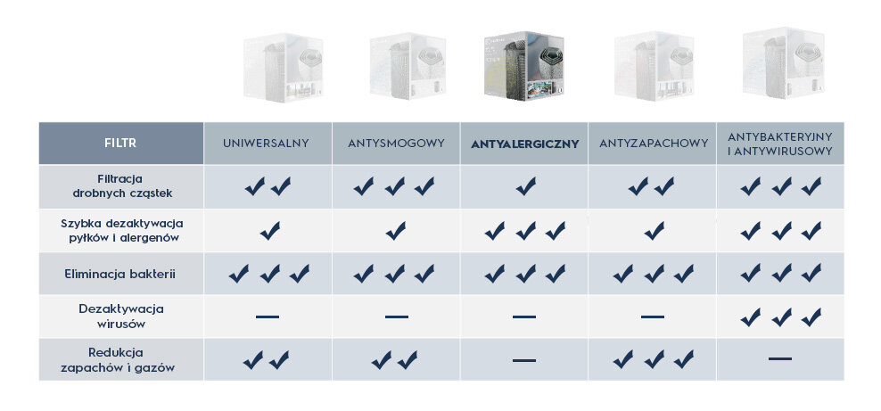 Każdy dom jest inny. Właśnie dlatego opracowaliśmy zestaw filtrów dostosowanych do konkretnych warunków powietrza w pomieszczeniach i do specyficznych potrzeb. Czy to jest filtracja nieprzyjemnych zapachów, alergenów czy pyłów PM1,0 PM2.5 i PM10 każdy użytkownik będzie mógł znaleźć odpowiedni filtr dla siebie i cieszyć się naturalnym powietrzem, dobrym samopoczuciem i komfortem.