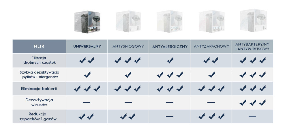Każdy dom jest inny. Właśnie dlatego opracowaliśmy zestaw filtrów dostosowanych do konkretnych warunków powietrza w pomieszczeniach i do odpowiednich potrzeb. Czy to jest filtracja nieprzyjemnych zapachów, alergenów czy pyłów PM1.0, PM2.5 i PM10, każdy użytkownik będzie mógł znaleźć odpowiedni filtr dla siebie.