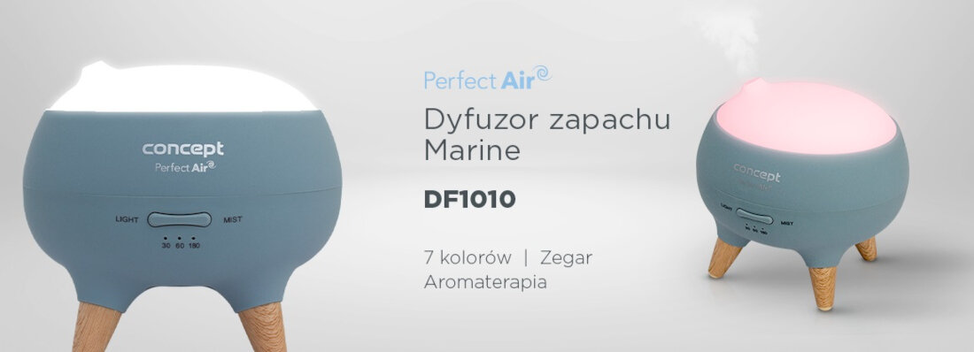Dyfuzor zapachowy CONCEPT DF1010 Perfect Air w kolorze morskim jest zasilany sieciowo i wprowadzi do Twojego wnętrza zapach świeżego powietrza. To doskonałe rozwiązanie, aby odprężyć się po dniu pracy lub stworzyć niesamowitą atmosferę w swoim domu.