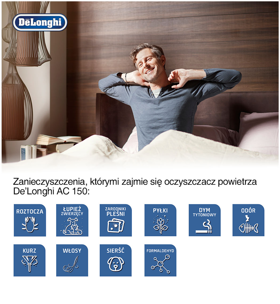 Bardzo ważne jest utrzymanie czystości oraz dbałość o jakość powietrza. Najlepszym i najprostszym rozwiązaniem jest zakup oczyszczacza powietrza. Te z serii AC De’Longhi zostały wyposażone w specjalistyczne filtry i szereg innowacji technologicznych, które sprawią, że powietrze w zamkniętych pomieszczeniach będzie zdrowsze, a przebywanie w nich - komfortowe. Pomagają kontrolować poziom alergenów, cząsteczek kurzu i innych zanieczyszczeń w domu.