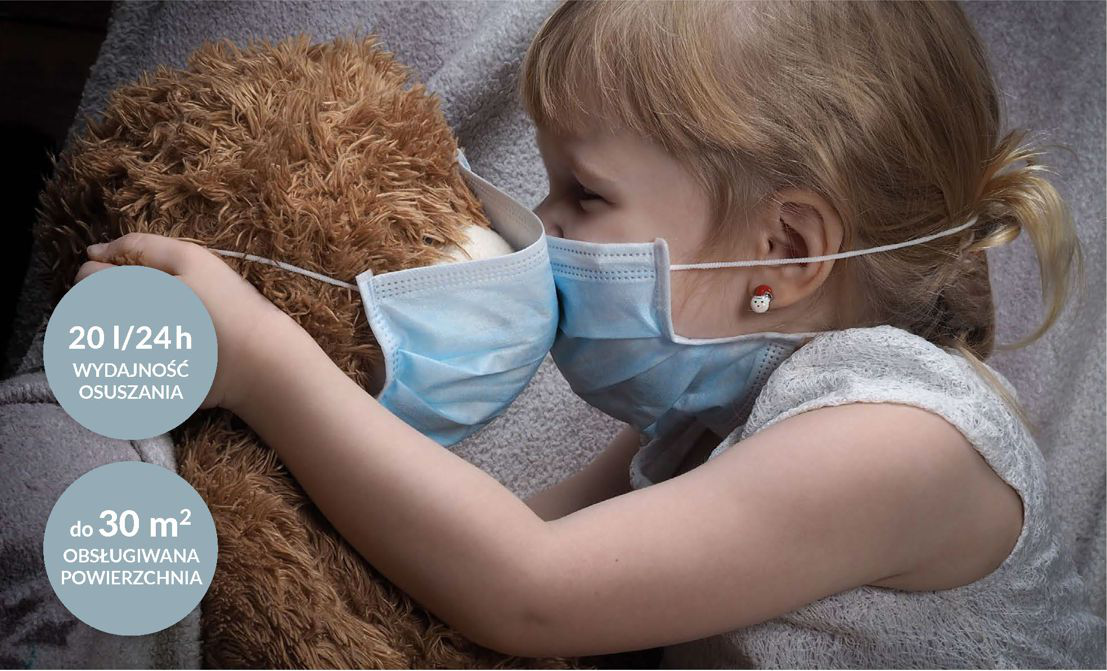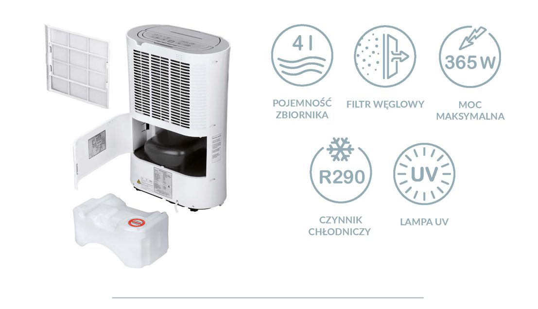 Sprzęt zapewnia bardzo dużą wydajność osuszania - 20 litrów na dzień i pojemnik na skroploną wodę - 4 l.