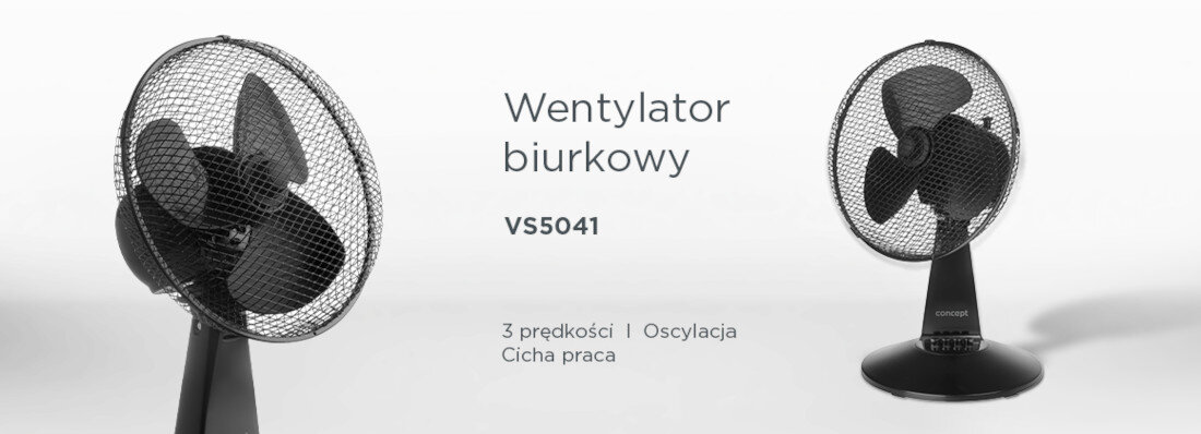 Wentylator biurkowy CONCEPT VS5041 ma 3 prędkości przepływu powietrza. Głowica wentylatora wyposażona jest w trzy łopatki i pozwala na skierowanie jej według własnych potrzeb – w poziomie i w pionie. Funkcja oscylacji z kątem obrotu zapewni równomierne rozprowadzenie zimnego powietrza po całym pomieszczeniu 80 ± 5°C.
