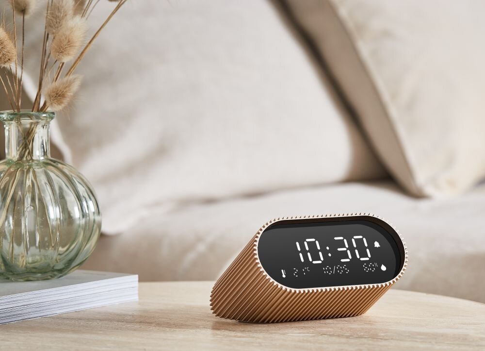 Zapewniając intuicyjne użytkowanie, budzik Ray Clock reaguje na Twoje gesty - wystarczy przechylić go na podstawie, aby go wyłączyć, a ponownie postawić w pozycji pionowej, by go aktywować. Dzięki szerokiemu wyborowi melodii i naturalnych dźwięków, budzisz się łagodnie, a tryb nocny pozwala Ci zasnąć w spokoju, bez zakłóceń ze strony światła ekranu.