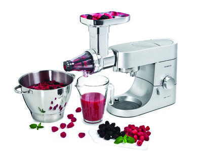 Podstawą działania przystawki jest wolno obracający się spiralny element, który rozgniata owoce o metalowe sitko, skutecznie wyciskając z nich sok. Ten mechanizm został opracowany tak, aby pomóc Ci przygotować przeciery z miękkich owoców i warzyw, zdrowe soki, puszyste puree oraz delikatne kremy i musy. Korpus i podajnik, wykonane ze stali, zmieniają to niewielkie urządzenie we wszechstronną pomoc kuchenną.