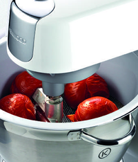Wyposażona w obracającą się łopatkę przystawka z łatwością przeciera warzywa, owoce oraz gotowe zupy i sosy na puszyste puree, sorbety czy kremy. Przy jej pomocy możesz także rozkruszyć herbatniki lub przesiać mąkę. W zestawie z przecierakiem otrzymasz dwa sitka: jedno z małymi, a drugie z dużymi otworami. Możesz stosować je dwustronnie, w zależności od rodzaju i składników potrawy, bowiem z jednej strony posiadają chropowatą, a z drugiej gładką powierzchnię.