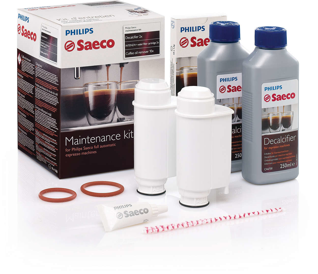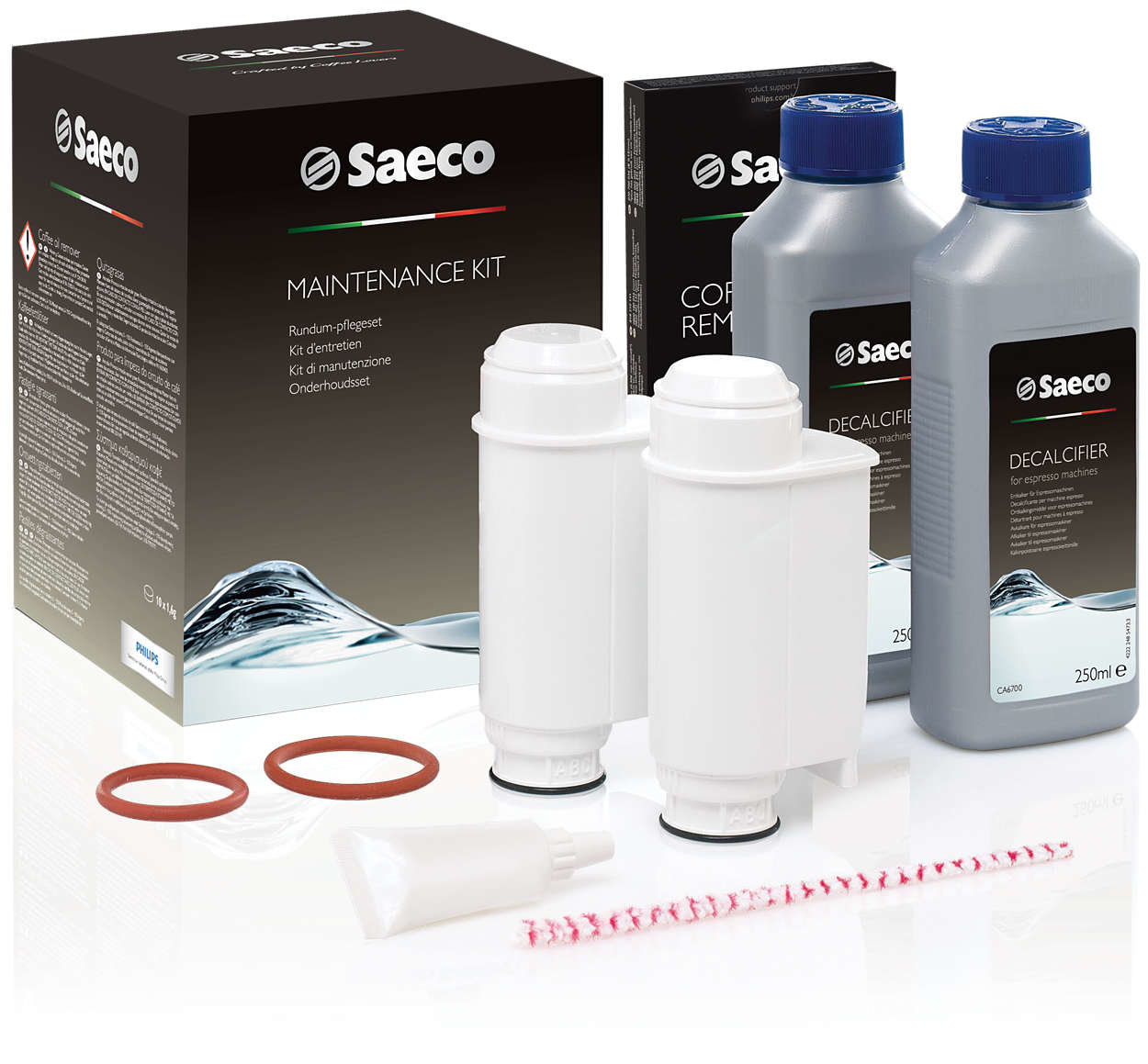 | Wszystko, czego potrzebujesz, aby zadbać o swój ekspres Kompletny zestaw do konserwacji ekspresu Saeco - do ekspresów do kawy Saeco - 2x preparat do kamienia i 2 filtry - 10 tabletek i zestaw do serwisu |