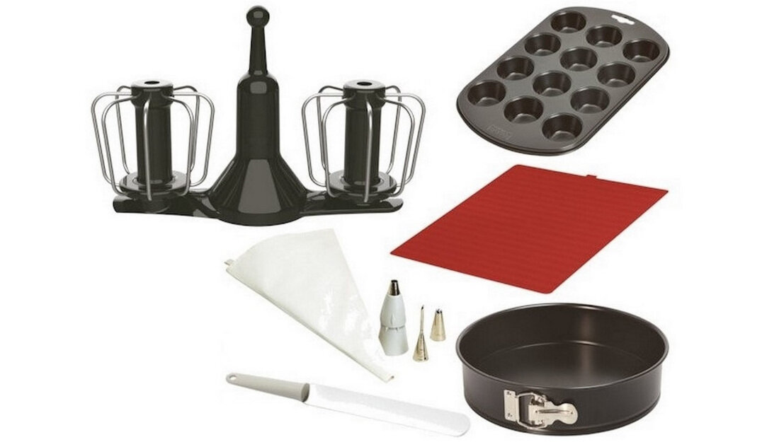 Zestaw cukierniczy TEFAL XF38H037 do Companion składa się z : łopatki, mieszaka, rękawu cukierniczego, tortownicy 24cm oraz 12-otworowej formy do muffinek.