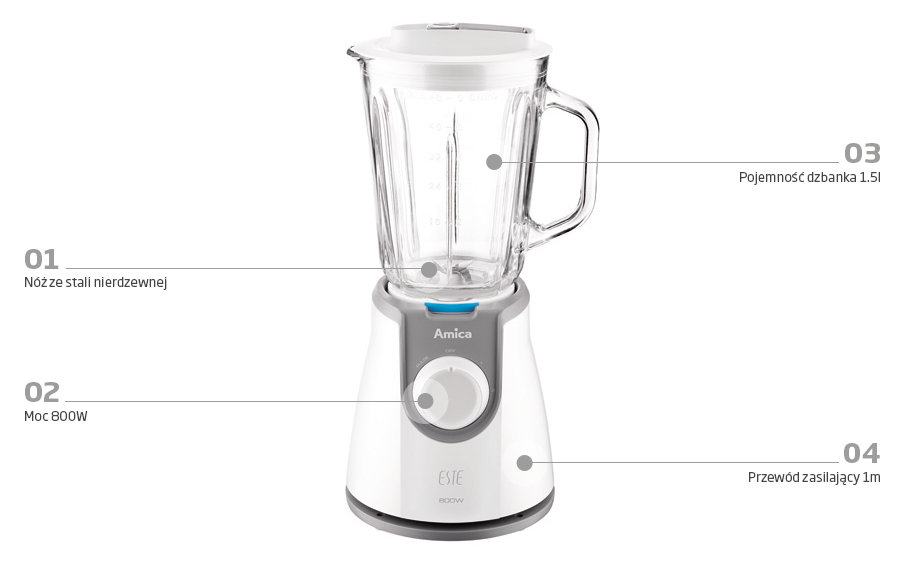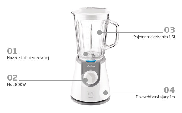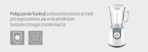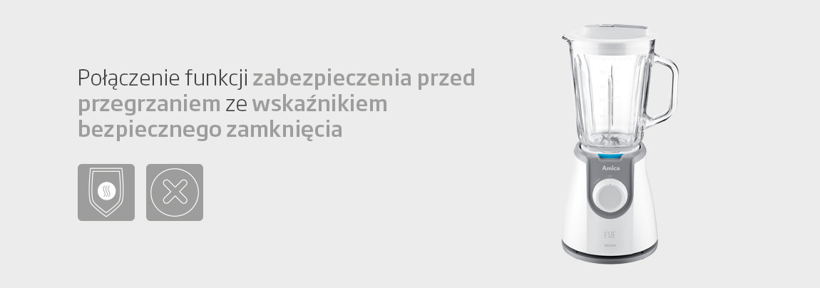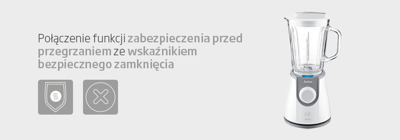 Chcesz mieć pewność, że przed każdym użyciem Twój blender będzie odpowiednio zamknięty? Dzięki użyciu w urządzeniach Amica specjalnego niebieskiego wskaźnika bezpiecznego zamknięcia, zostaniesz każdorazowo poinformowany o jegho prawidłowym zamontowaniu!