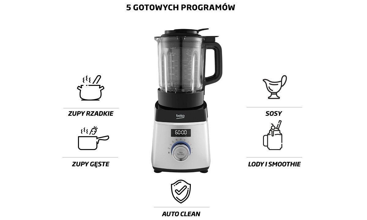 Tradycyjna zupa, gładki krem, sos, a może przecier? Wystarczy, że ustawisz odpowiedni program, a blender z funkcją gotowania zrobi resztę za Ciebie. Z nim przygotowanie pożywnej zupy czy śliwkowych powideł na zimę to pestka! Dodatkowo, po zakończeniu pracy, blender ten utrzyma przygotowaną potrawę w odpowiedniej temperaturze nawet przez 40 minut. Przez ten czas zdążysz zawekować zapasy lub przygotować resztę obiadu.