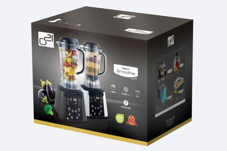 Silnik w blenderze G21 Smart Smoothie to bardzo wydajne i bardzo mocne urządzenie. Duża prędkość obrotów (32 000) przy mocy 1680 W, wymaga ogromnej precyzji i dbałości o każdy detal. Inżynierowie zadbali o to, aby tą ogromną moc zmieści w eleganckiej symetrycznej obudowie o rozmiarach 23/23/23 cm. Obudowa z eleganckim połyskiem lub klasycznym matem (w zależności od wariantu kolorystycznego blendera) nie daje po sobie poznać, że schowany w niej jest tak wydajny i mocny silnik blendera.