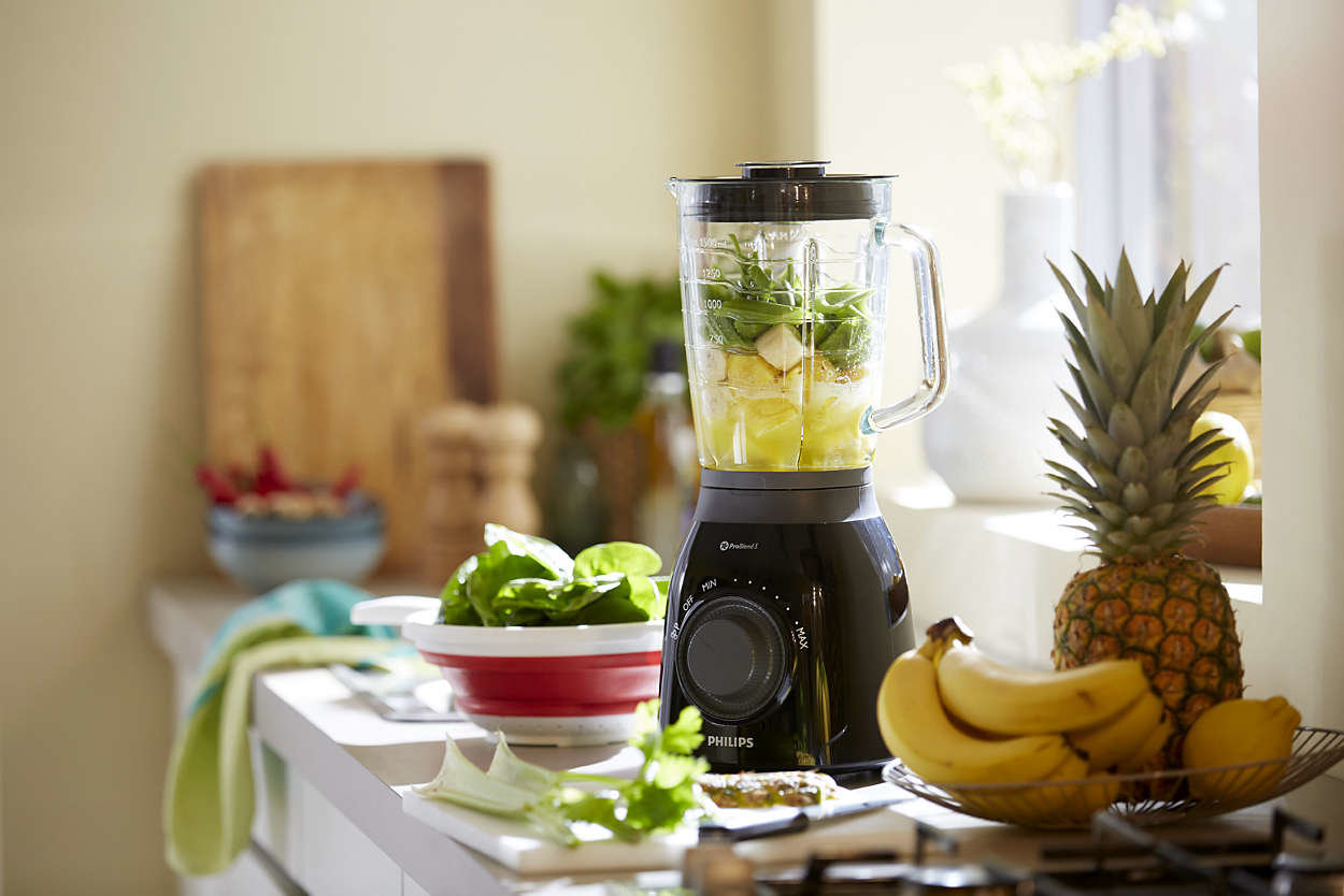| Bardziej jedwabisty zielony koktajl w kilka sekund Dokładniejsze rozdrobnienie dzięki technologii ProBlend 5* -600 W -Szklany dzbanek o pojemności 2 l -Wiele ust. prędkości i funkcja pulsacji -ProBlend 5 |