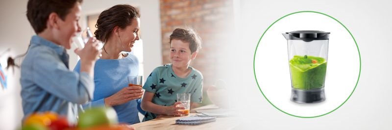 Aby zaoszczędzić czas, zmiksuj napój wprost do bidonu i zabierz go ze sobą. Dołączone do zestawu dwa bidony o pojemności 0,6 l pozwolą Ci delektować się smacznymi i zdrowymi napojami wszędzie tam, gdzie będziesz mieć na to ochotę.
