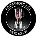 Ten blender o mocy 600W posiada ostrza ze stali nierdzewnej z 4 nożykami, które można bez trudu wyjąć i umyć. Duży kielich o pojemności 1,5 l można łatwo odłączyć od podstawy. Dzięki gumowym nóżkom, urządzenie nie ślizga się na blacie. Dodatkowo, w pokrywie umieszczono korek do odmierzania składników.