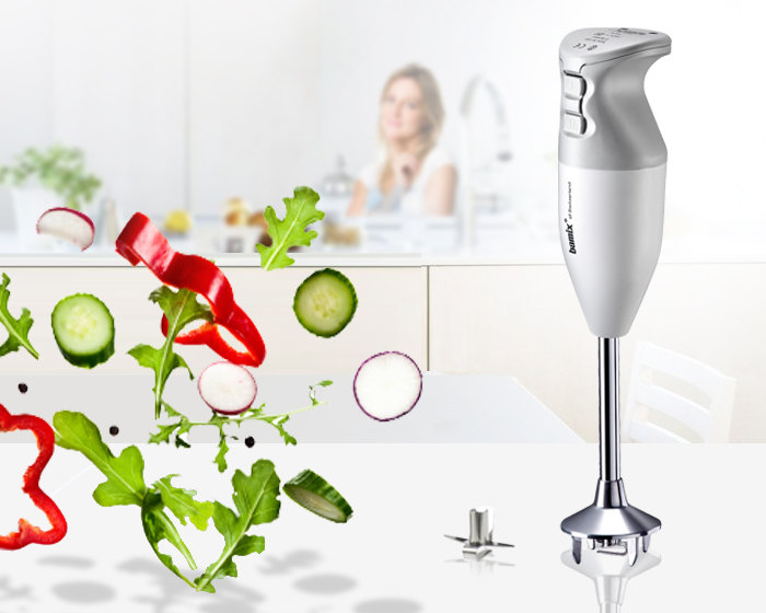 Lekki i poręczny Kształt blendera Bamix oraz użyte materiały sprawiają, że urządzenie pewnie leży w dłoni. Blender jest przy tym lekki i nie wibruje nawet przy maksymalnych obrotach. |