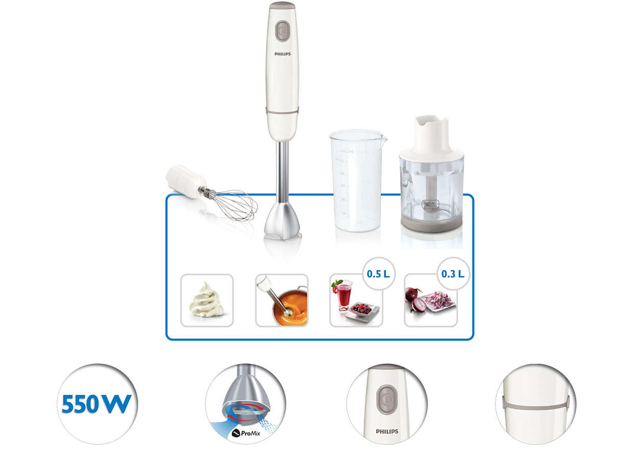 Rozdrabniacz do siekania ziół, orzechów, sera, czekolady i cebuli Niewielki rozdrabniacz blendera ręcznego firmy Philips umożliwia siekanie ziół, orzechów, sera, czekolady i cebuli. |