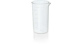 Dzbanek blendera ręcznego o pojemności 0,5 l z miarką Dzięki dzbankowi o pojemności 0,5 l można odmierzyć ilość składników do przepisów, ale również szybko zmiksować zupy, przeciery i koktajle. |