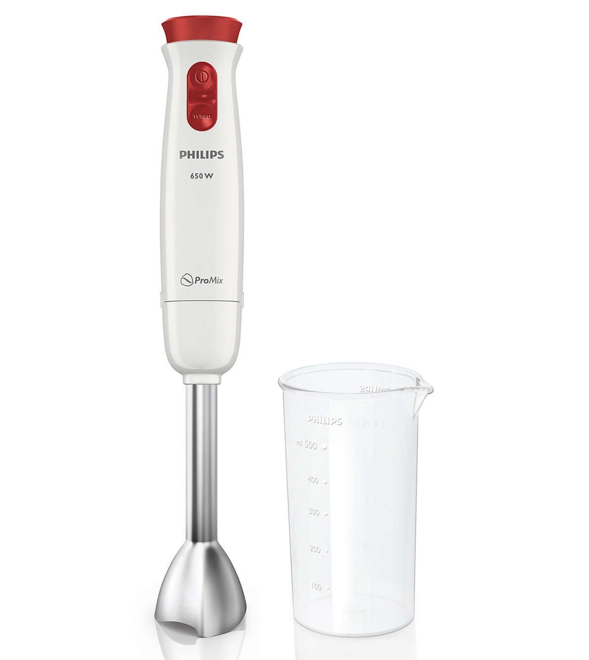 | Większa moc zapewniająca znakomite rezultaty! Blender ręczny ProMix o mocy 650 W z funkcją turbo -650 W, metalowa końcówka -ProMix -Dzbanek 0,5 l -2 prędkości (w tym turbo) |