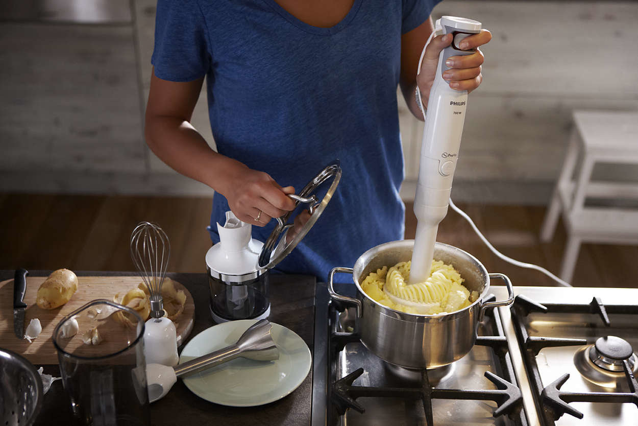 | Tłuczek do ziemniaków pozwala na przygotowanie gładkiego puree Tłuczek dołączany do blendera ręcznego Philips umożliwia przygotowanie gładkiego puree. |