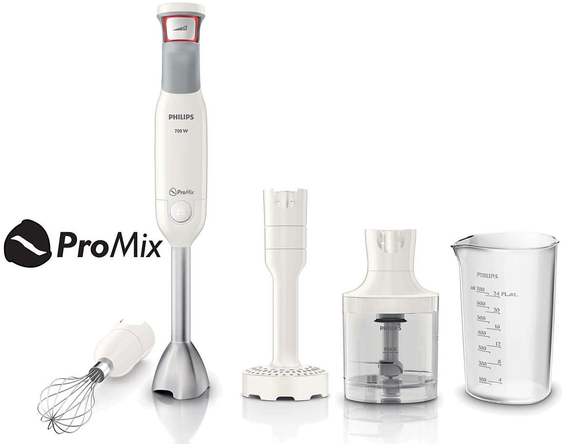 | Pełna kontrola oraz różnorodność świeżych posiłków! Przygotowywanie różnorodnych posiłków dzięki funkcji SpeedTouch -700 W, Promix, metalowa końcówka -Regulacja prędkości i funkcja turbo -Rozdrabniacz., tłuczek, trzepaczka, dzbanek |