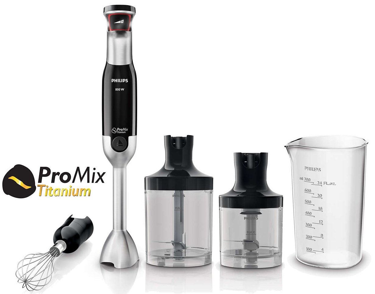 | Łatwy w obsłudze blender ręczny o dużej mocy! Przygotowywanie różnorodnych posiłków dzięki funkcji SpeedTouch -800 W, ProMix, metalowa końcówka -Funkcja SpeedTouch i funkcja turbo -2 rozdrabniacze, trzepaczka, dzbanek |