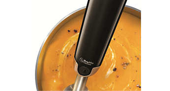 Technologia SpeedTouch pozwalająca intuicyjnie ustawić właściwą prędkość Intuicyjnie regulowanie ustawienia prędkości oraz funkcja turbo w jednym przycisku, którego mocniejsze naciśnięcie wyzwala większą moc. Rozpocznij miksowanie powoli, aby nie rozpryskiwać składników, a następnie płynnie przyspieszaj aż do osiągnięcia prędkości wymaganej dla dowolnego zastosowania i typu składnika. Teraz do przygotowania ulubionych dań wystarczy naciśnięcie przycisku. |