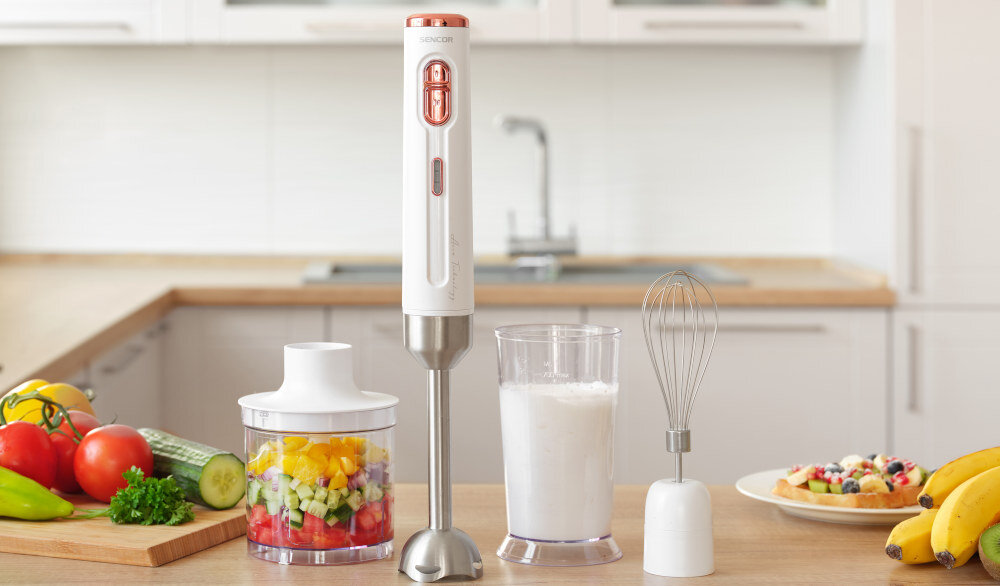 Blender SENCOR SHB 9000WH wyposażono w końcówki miksujące o powłoce tytanowej, dzięki czemu nie straszne mu zadrapania, wygodny przycisk na froncie urządzenia w łatwy sposób uwalnia końcówki bez brudzenia sobie rąk. Urządzenie oferuje wysoką moc 200W, co za tym idzie pokruszy nawet lód!