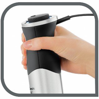 Miękki i antypoślizgowy uchwyt ręczny Specjalnie zaprojektowany ergonomiczny kształt zapewnia pewny i mocny uchwyt przy codziennej pracy, gwarantując jednocześnie pełną kontrolę nad urządzeniem. Dzięki ergonomicznej obudowie blender nie wyślizgnie się z rąk. |