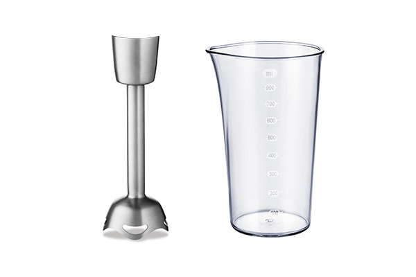 Końcówka blendująca ze stali nierdzewnej wraz z pojemnikiem 800ml do przygotowania zup-kremów, jedzenia dla dzieci czy koktajli. |