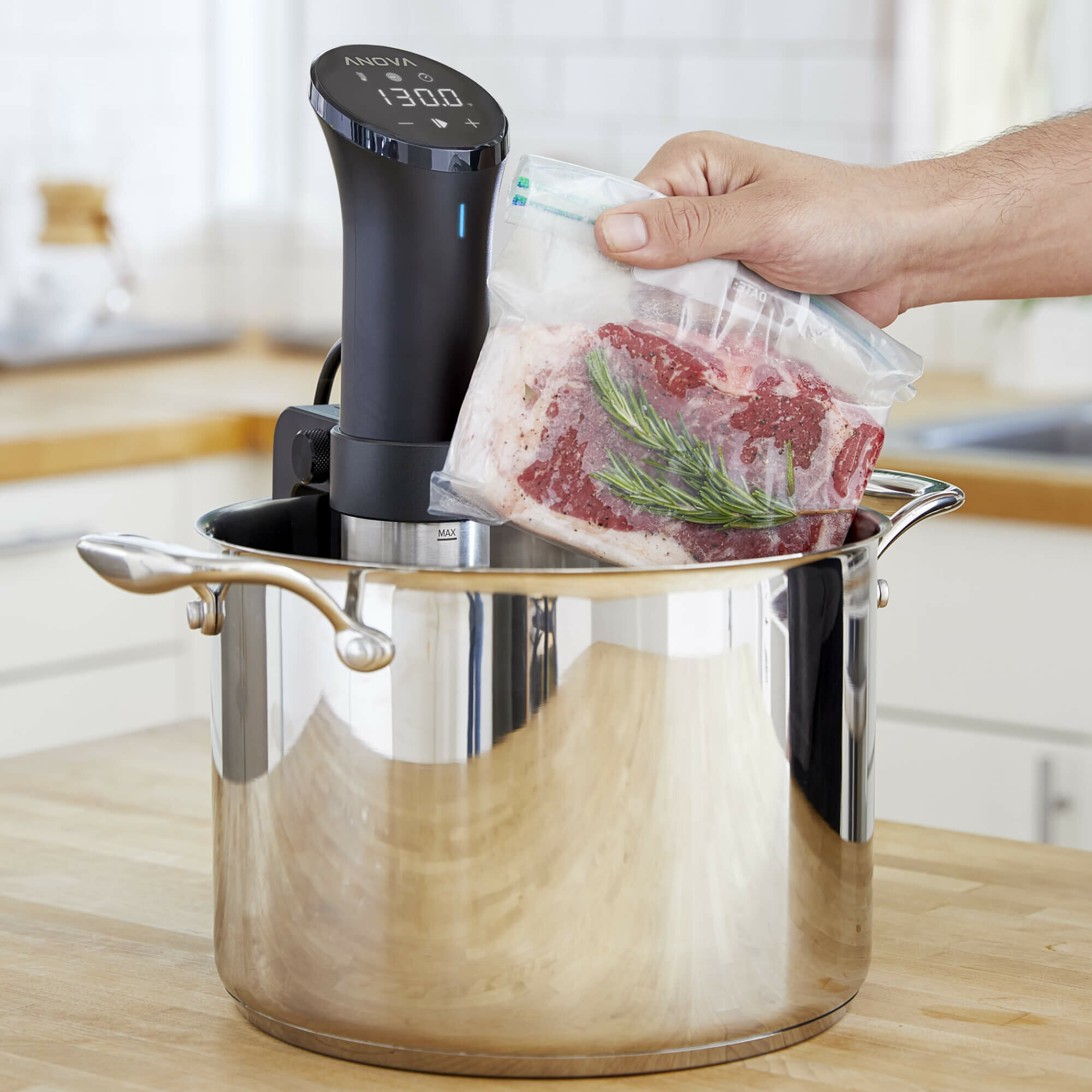 Kompaktowy rozmiar nowego cyrkulatora Anova Precision® Cooker to gwarancja znalezienia miejsca w każdej szufladzie kuchennej. Dzięki temu będziesz mógł bez żadnych przeszkód sięgać po urządzenie kiedy tylko zajdzie taka potrzeba.