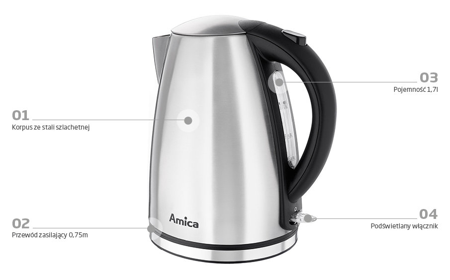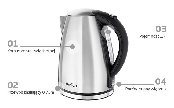 Ile razy obawiałeś się, że Twój sprzęt się przegrzeje podczas codziennego użytkowania? Dzięki potrójnemu systemowi termostatu zastosowanemu w czajniku Amica, którego zadanie polega na automatycznym wyłączeniu urządzenia po zagotowaniu wody oraz ochronie przed nieplanowanym uruchomieniem czajnika pustego lub z otwartą pokrywką – będziesz spokojny o bezpieczeństwo swoje i swoich najbliższych, podczas codziennego korzystania z urządzenia!