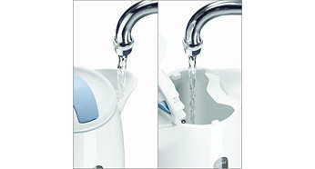 | Zdejmowana pokrywka z dużym otworem umożliwia łatwe napełnianie i czyszczenie Czytelne wskaźniki poziomu wody z obu stron czajnika elektrycznego firmy Philips umożliwiają obsługę prawą lub lewą ręką. |