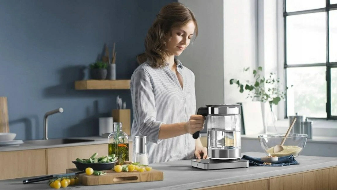 Czajnik pozwala na jednorazowe zagotowanie 1,6 l wody. Elegancka podstawa z czarnym wykończeniem zawiera panel do sterowania wielofunkcyjnym urządzeniem.